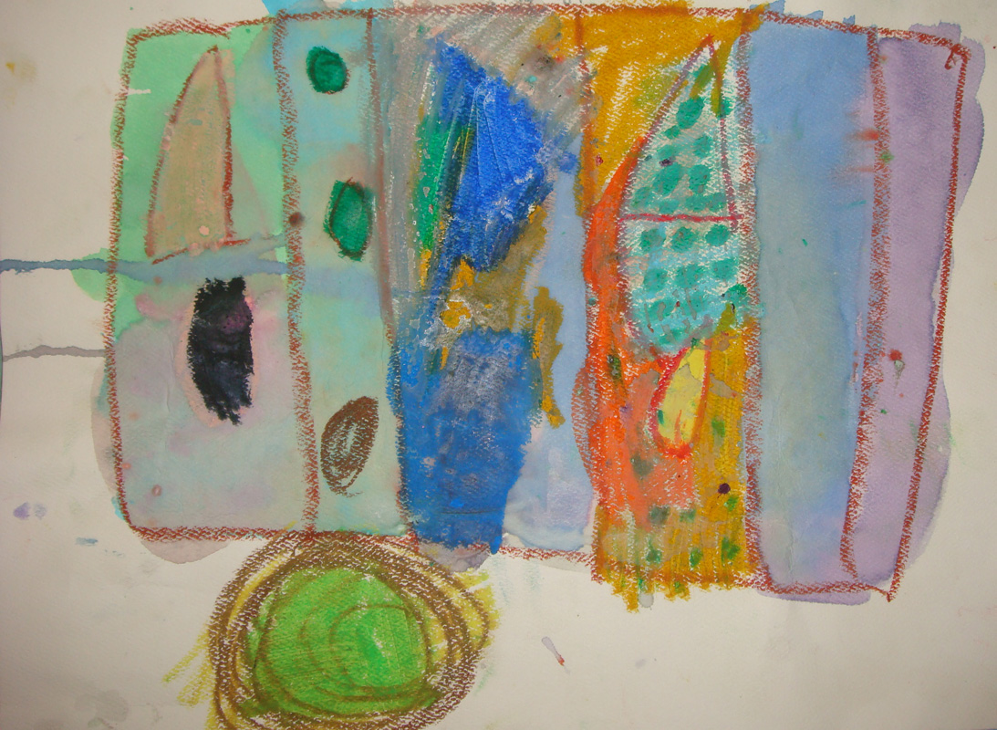 When you finish your drawing, lightly brush paint over the picture. The areas of crayon will resist the paint.Let the kids enjoy the medium. Shapes do not need to be perfect: in fact, squarish, crooked and off-centre look better than perfect.